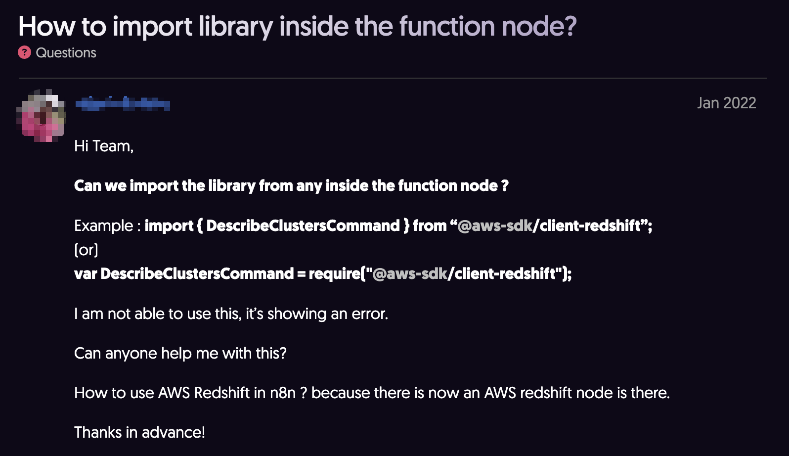 However, Zapier and n8n chose cloud-based execution, where cloud-based code editing cannot introduce third-party dependencies, or it's extremely difficult to do so. This already limits their code editing experience from ever reaching the level of freedom they desire. The n8n team may have realized this problem, so they offer self-hosting options that allow users to introduce third-party libraries for code, but their primary cloud-based execution still cannot achieve this functionality.