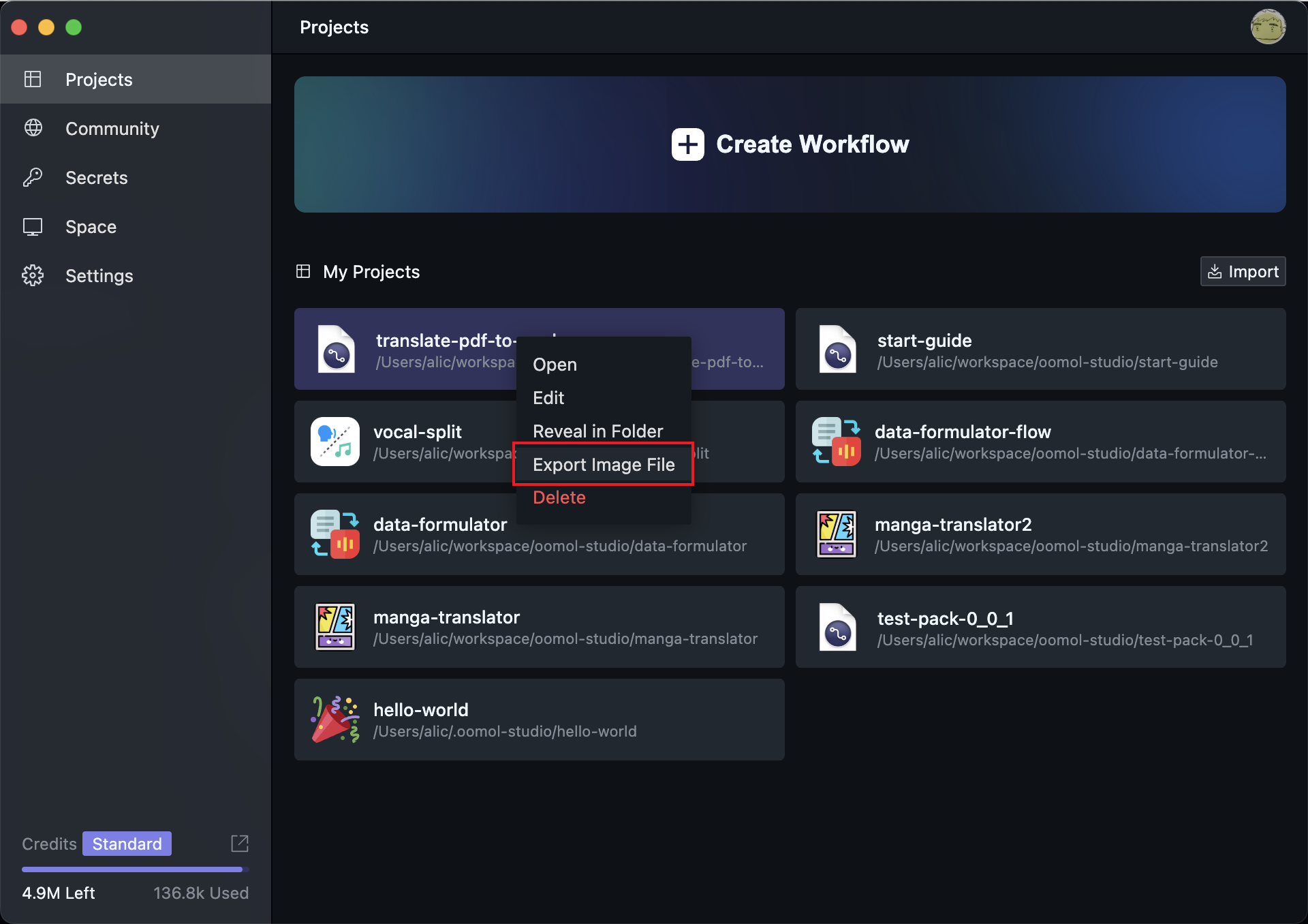 OOMOL Studio expects users to truly achieve workflow automation and improve productivity, so it designed image export methods, enabling user-developed workflows to be deployed to the cloud in users' expected ways.